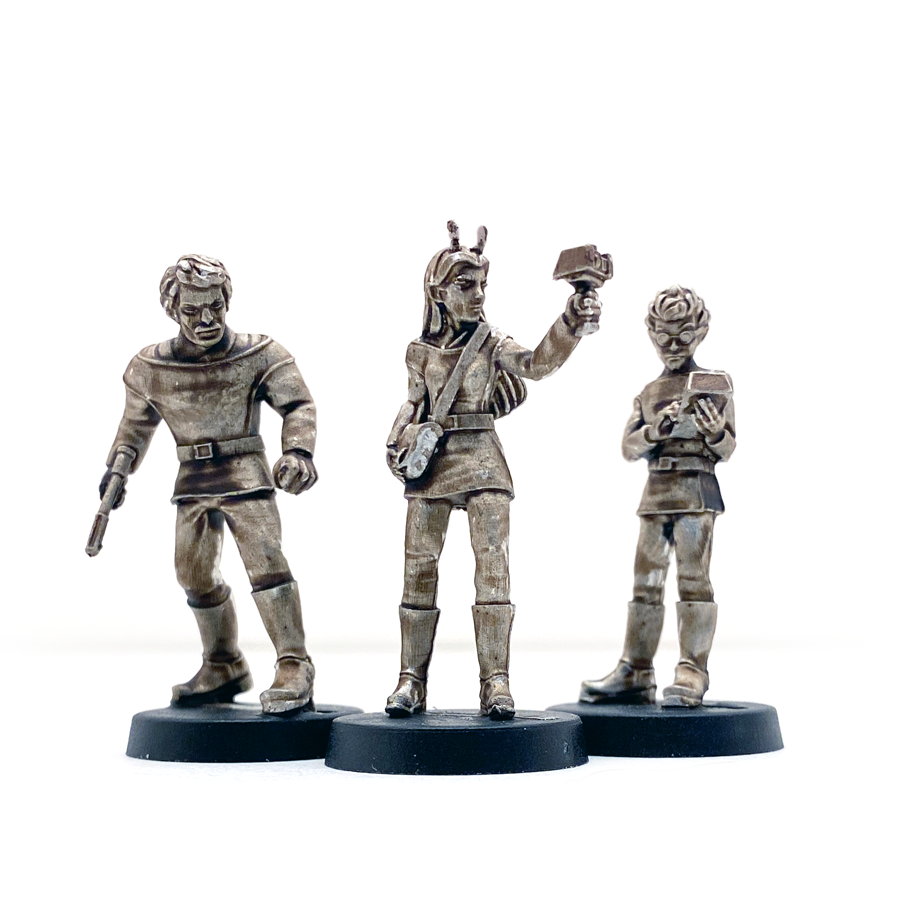 Three officers of the heroic Explorer Corps. A chief engineer, alien medical officer, and plucky science ensign.