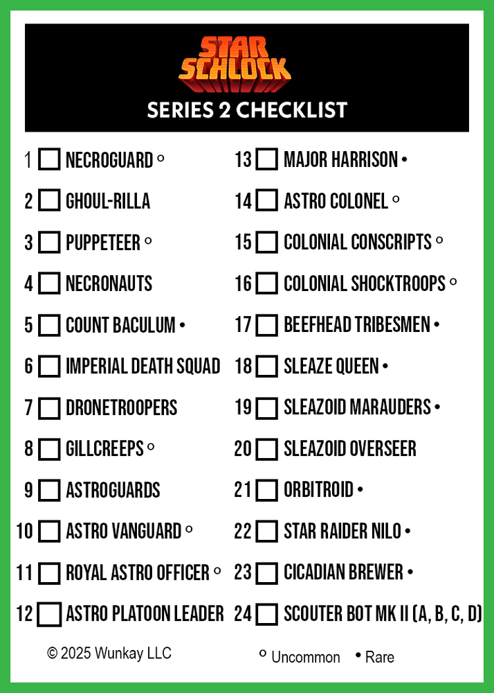 The roster of collectible Star Schlock trading cards expands with Series 2, packed in vintage-style wax wrappers just like in the 1970s and 80s! Collect Star Schlock cards with full color artwork on one side, and complete unit profiles on the back for easy reference during the game.